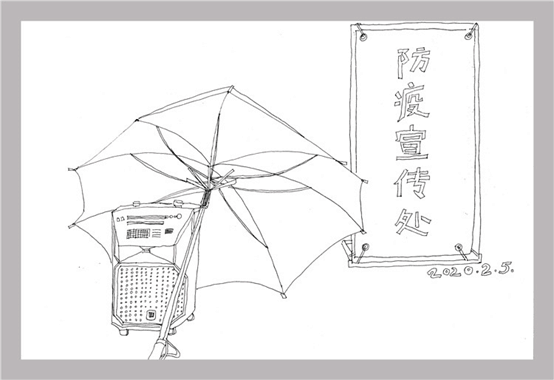 《雨伞下的喇叭》:一把小小的雨伞,守护着认真工作的大喇叭。它挡住了淅淅沥沥的冬雨,也挡住了人们心里的恐惧和悲伤。