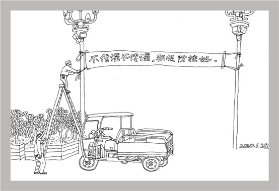 《挂标语》 :不怕爬高,只怕病毒。只有让每个人都重视起来,才能早日打赢疫情阻击战。