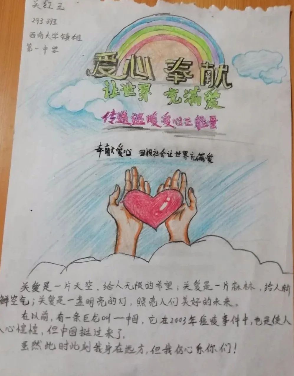 ●作品介绍:“关爱是一片天空,给人无限的希望;关爱是一片森林,给人新鲜空气;关爱是一盏明亮的灯,照亮人们美好的未来。在以前,有一条巨龙叫—中国,它在2003年瘟疫事件中,也是使人人心惶惶,但中国挺过来了”