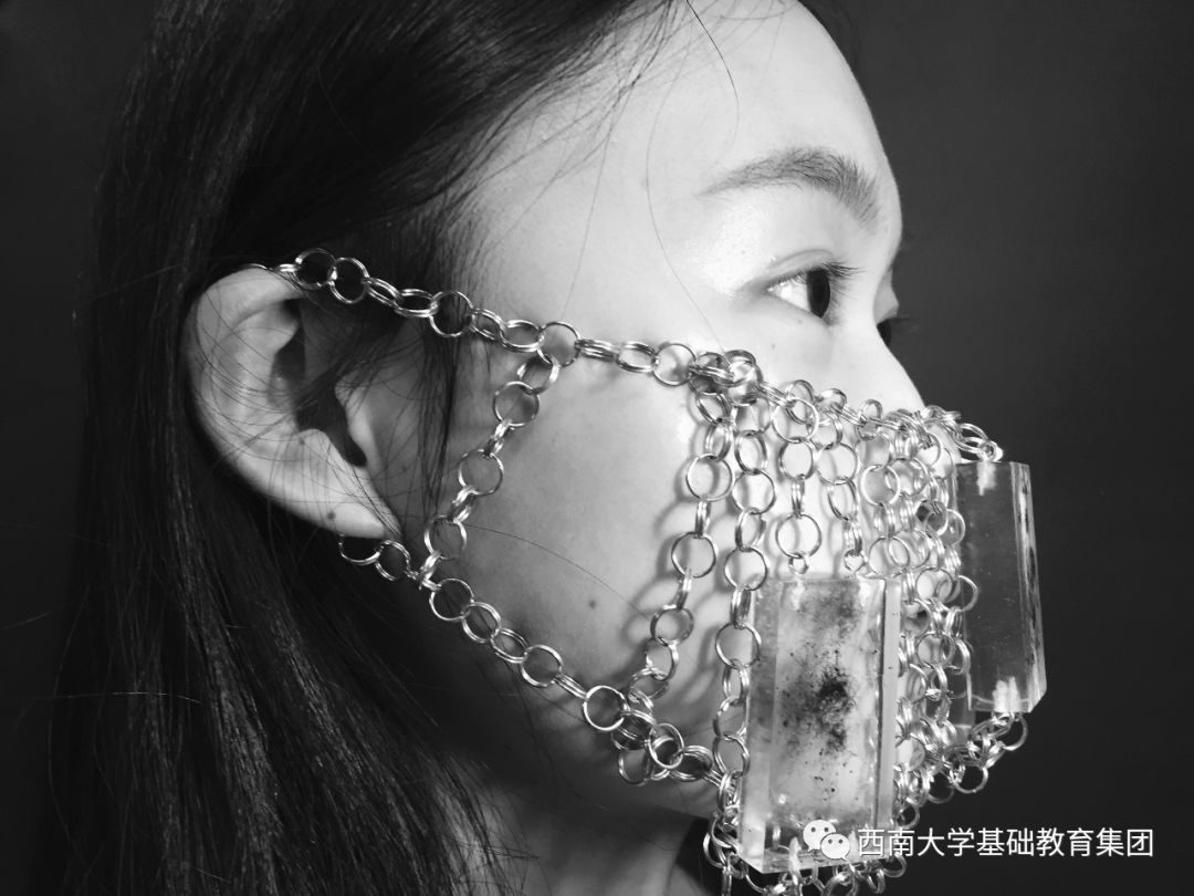 蒋老师的这幅作品将视角放在了保护野生动物上面,以四分之三满构图的方式特写了人物的侧脸,并为该人物戴上了一个铁链与玻璃构成的口罩。该道具看似是保护,实则是束缚,衬托出真正的保护要从与自然和谐的可持续生活开始。画面艺术感强烈,人物情感传达到位。