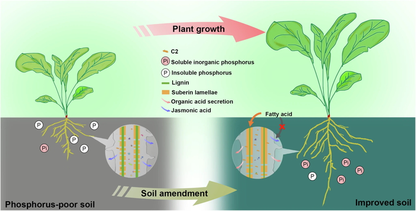 该研究通过对50份油菜种质资源材料的多组学关联分析等研究方法发现,在低磷条件下,油菜幼苗通过减少根系木栓质的沉积来提升对磷的吸收,但木质素水平的升高和茉莉酸(JA)、淀粉等物质的积累却限制了侧根的伸长。黄杆菌C2能够释放有机酸,以提高土壤中无机磷的含量。更重要的是,C2重构了油菜根系中α-亚麻酸代谢介导的JA和木栓质生物合成网络,这一过程不仅促进了C2在根系的定殖,还改善了油菜根系对磷的吸收和植株的营养生长状况。这种相互作用为提高农业中磷的利用效率和减少作物对磷肥的依赖提供了潜在的策略。相关的有益菌也已获批发明专利保护,为作物有益菌肥的开发提供了良好的技术支撑。