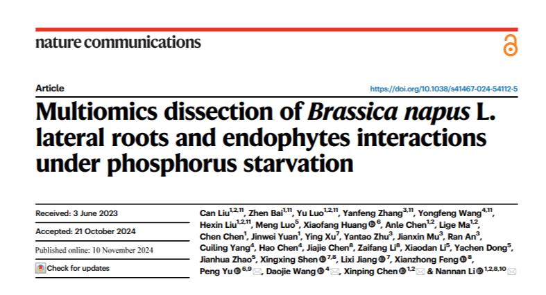 近日,国际著名期刊《自然通讯》(Nature Communications)在线发表了资源环境学院植物营养与调控团队的研究论文《多组学分析揭示磷缺乏条件下油菜侧根与内生菌的相互作用》(Multiomicsdissection ofBrassicanapusL. lateral roots andendophytesinteractions under phosphorus starvation)。BEAT365英国官网为论文第一完成单位。学校李楠楠教授和陈新平教授为通讯作者,博士后刘灿为第一作者。该研究得到了国家重点研发计划、国家自然科学基金、国家级青年人才项目和河南省重点研发计划等项目的资助。
