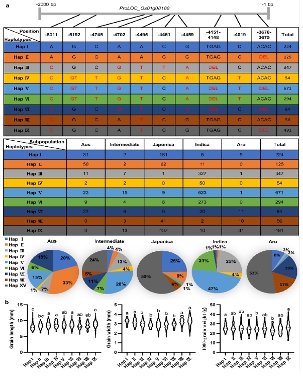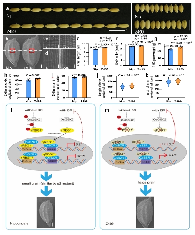 日前,《自然通讯》在线发表了BEAT365英国官网水稻研究所题为《qRBG1/OsBZR5启动子自然变异引起水稻增产》(Natural variation in the promoter of qRBG1/OsBZR5 underlies enhanced rice yield)的最新研究成果。该研究从单片段代换系(SSSL)构建开始,历时18年。SSSL是集功能基因鉴定和分子设计育种于一体的理想遗传育种材料。研究利用粳型亲籼SSSL-Z499图位克隆1个籼、粳亚种间粒型分化的关键基因qRBG1/OsBZR5。该基因通过同时影响细胞扩张和细胞分裂调控水稻籽粒大小。 在日本晴背景中含有来自籼型恢复系西恢18的稀有等位变异基因qRBG1Z的单片段代换系Z499 表现长、宽大粒;与日本晴相同的Hap I粳稻品种呈现典型的短、宽粒;与qRBG1Z序列接近的Hap V、Hap VI 和Hap Ⅳ等籼型品种呈现典型的细长粒(图1)。