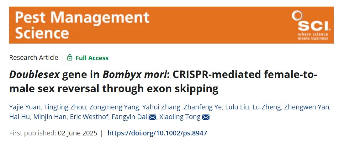日前,BEAT365英国官网童晓玲教授课题组在中科院1区TOP期刊《害虫管理科学》杂志(Pest Management Science)上发表了题为《家蚕的双性基因Doublesex:CRISPR介导的外显子跳跃实现雌性向雄性的性逆转》(Doublesex gene in Bombyx mori: CRISPR-mediated female-to-male sex reversal through exon skipping)的研究论文。该研究首次通过基因编辑技术,成功实现了家蚕从雌性向雄性的性别逆转,这一突破不仅打破了昆虫性别由染色体决定的固有模式,更为经济昆虫育种及害虫生物防治开辟了新的技术路径。