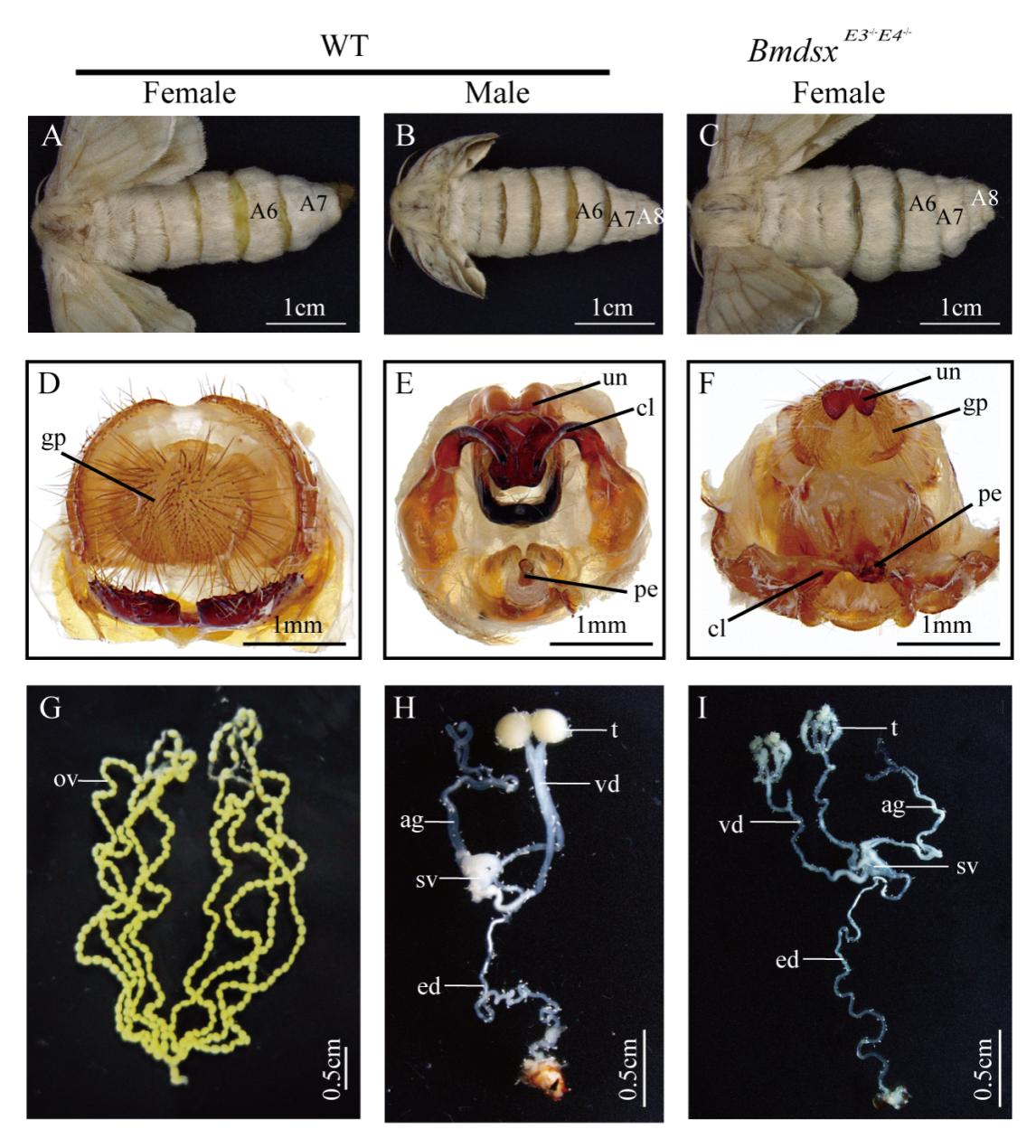 经过基因编辑的雌性家蚕(性染色体为ZW型)在成虫阶段发生了惊人转变:原本7节的腹部变成了雄性特有的8节,并生长出雄蚕生殖器官,体内还发育出完整的精囊、输精管等。这一成果标志着家蚕性别控制技术取得了重大突破。