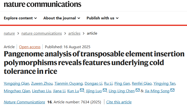 近日,农学与生物科技学院联合广西大学、崖州湾国家实验室在《自然通讯》(Nature Communications)发表了题为《转座元件插入多态性的泛基因组分析揭示水稻耐寒性特征》(Pangenome analysis of transposable element insertion polymorphisms reveals features underlying cold tolerance in rice)的研究论文,创新性提出基于图形泛基因组的 TIPs-GWAS(转座子插入多态性全基因组关联分析)策略,为作物适应性性状遗传解析提供新方案。