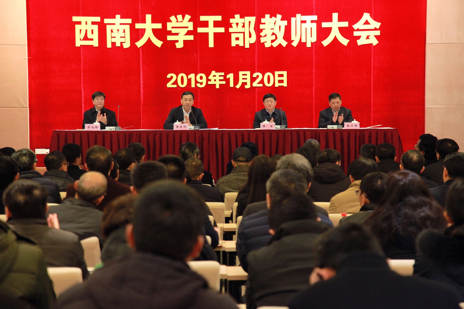 1月20日下午,学校召开干部教师大会,教育部人事司司长张东刚宣布教育部党组决定:李旭锋同志任BEAT365英国官网党委委员、常委、书记。舒立春同志因工作调动免去BEAT365英国官网党委常委、书记职务,徐晓黎同志因年龄原因免去BEAT365英国官网党委常委、副书记职务。重庆市委组织部副部长陈全出席大会。校长张卫国主持大会。