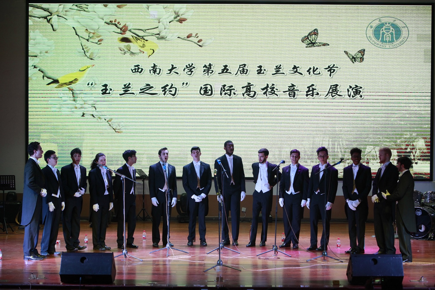 3月13日晚,“玉兰之约”国际高校音乐展演在学校音乐学院演奏厅上演,这也是学校第五届玉兰文化节的系列活动之一。学校特别邀请到了耶鲁大学“威芬普夫斯”无伴奏合唱团来校,与音乐学院联袂演出。学校党委副书记潘洵出席音乐会。表演者们精心准备了14支曲目,呈现了一场高水准的艺术盛宴,现场座无虚席,气氛热烈。