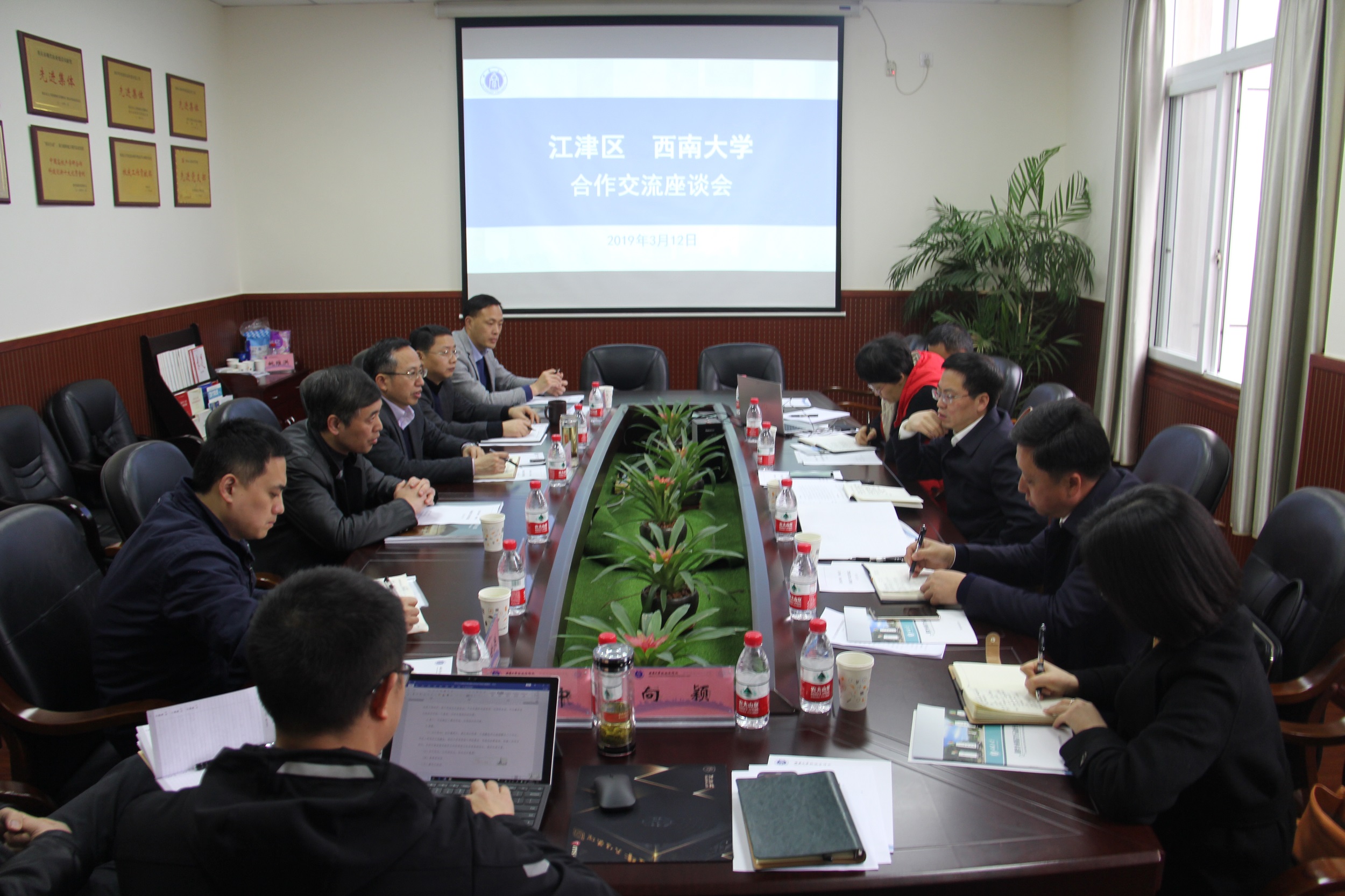 3月12日,重庆市江津区区委常委、宣传部部长秦敏,白沙镇党委书记黄丁等一行来校洽谈乡村振兴及文化合作事宜,学校党委副书记潘洵,校地合作处处长程龙、副处长杨明厚,宣传部副部长蒋寒及相关专家参加座谈会。