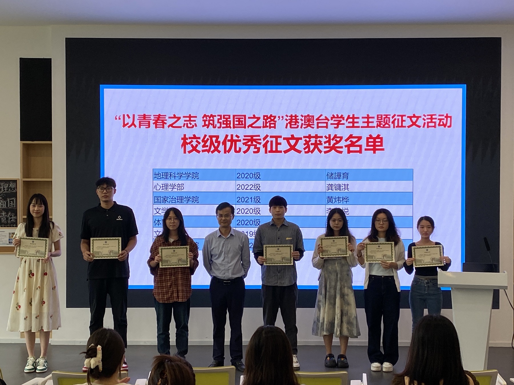 会议为荣获“以青春之志,筑强国之路”主题征文活动全国三等奖的2020级体育学院李宗谚同学以及荣获校级优秀奖的7位港澳台学生颁发证书。李宗谚分享了参赛心路历程和征文《青春正飞扬,青年永担当》内容,把青春的正能量传递给现场同学。