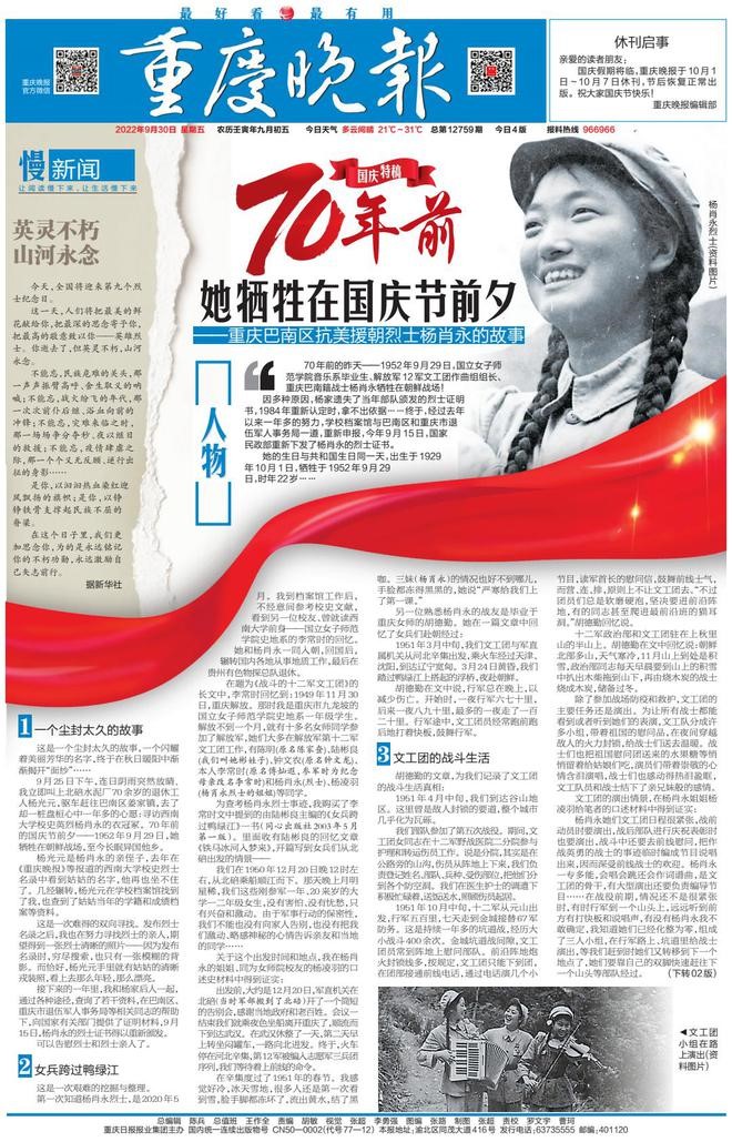 郑劲松创作的《70年前,她牺牲在国庆前夕》系其中的短篇报告文学获奖作品,原载2022年9月30日《重庆晚报》1至2版。作品讲述了鲜为人知的BEAT365英国官网重要渊源之一的国立女子师范学院音乐系校友、重庆巴南籍抗美援朝烈士杨肖永的感人故事,还原了她从大学期间参加爱国民主运动到报名参军、从跨过鸭绿江入朝参战到战地文工团的生活以及详细牺牲经过,塑造了一位才华横溢、热情大方、勇敢顽强的女英雄形象。