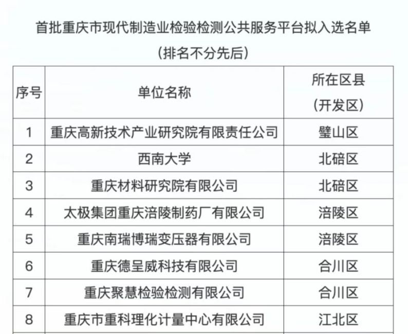 重庆市现代制造业检验检测公共服务平台主要围绕“33618”现代制造业集群发展开展创建,主要职能包括:参与研究制定全市现代制造业检验检测相关行业规划、法规、政策、标准;开放共享仪器、设备、信息等检验检测资源,提供检验检测、技术咨询等服务;建立区域性、行业性人才培养基地推广先进检验检测方法;参与检验检测装备研制与开发。