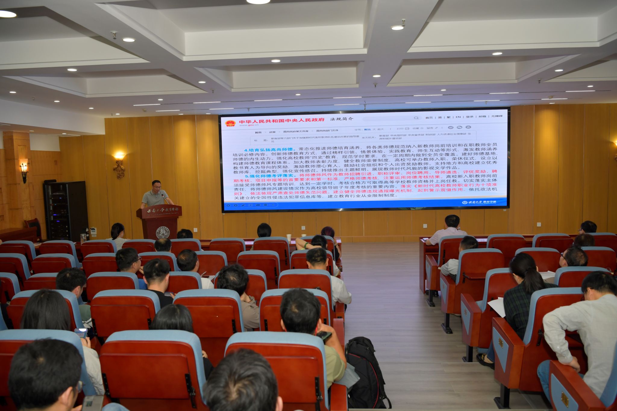 李燕部长以学校优秀教师事迹和违反师德师风警示案例切入,号召全体教师以“教育家精神”为指引,强化规矩意识和自律意识,坚持立德树人,潜心教书育人,争做“四有”好老师。