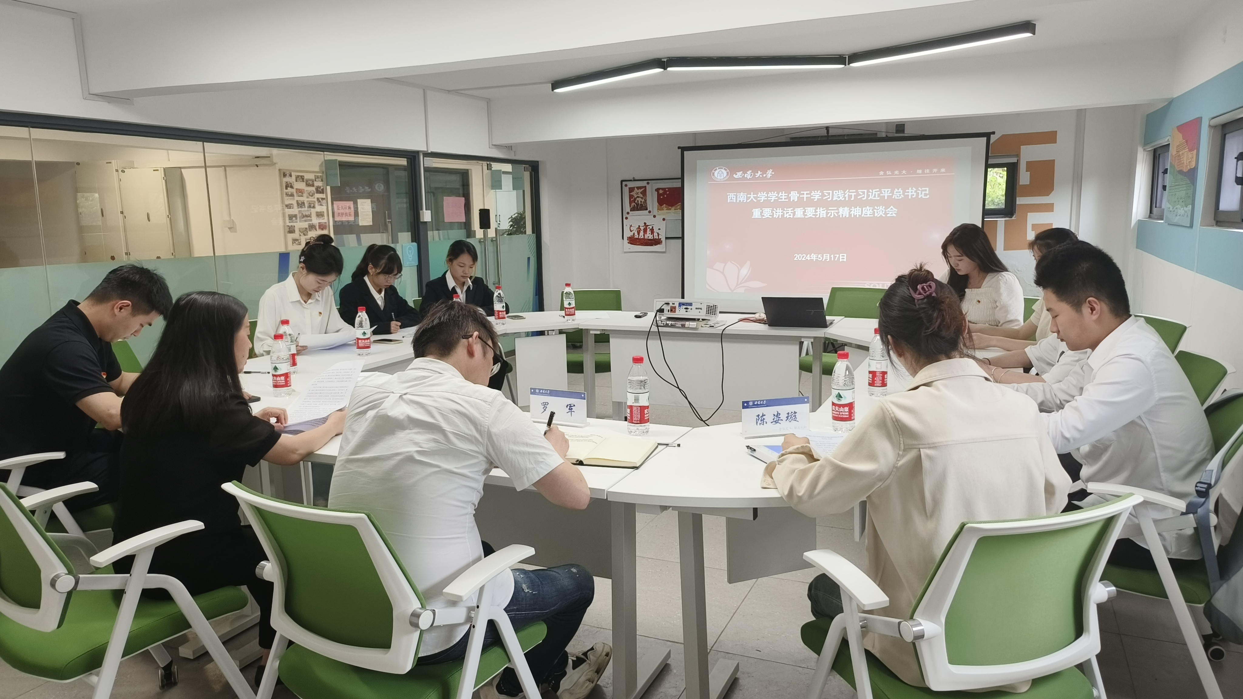 为深入学习习近平总书记视察重庆重要讲话重要指示精神及新时代推动西部大开发座谈会会议精神,贯彻落实习近平总书记对新时代青年重要寄语精神及对学校思政课建设作出的重要指示,不负习近平总书记对广大青年学子的殷切期待,2024年5月17日,BEAT365英国官网学生骨干学习践行习近平总书记重要讲话重要指示精神座谈会在荣昌校区青樟空间召开,学校党委学生工作部(处)副部(处)长罗军、新闻传媒学院辅导员郭志聪、商贸学院辅导员陈姿璇出席会议,学生党员示范班代表、优秀学生标兵代表、荣昌校区学生骨干代表参加,会议由学校党委学生工作部(处)副部(处)长、荣昌校区学生工作办公室主任罗艳芬主持。