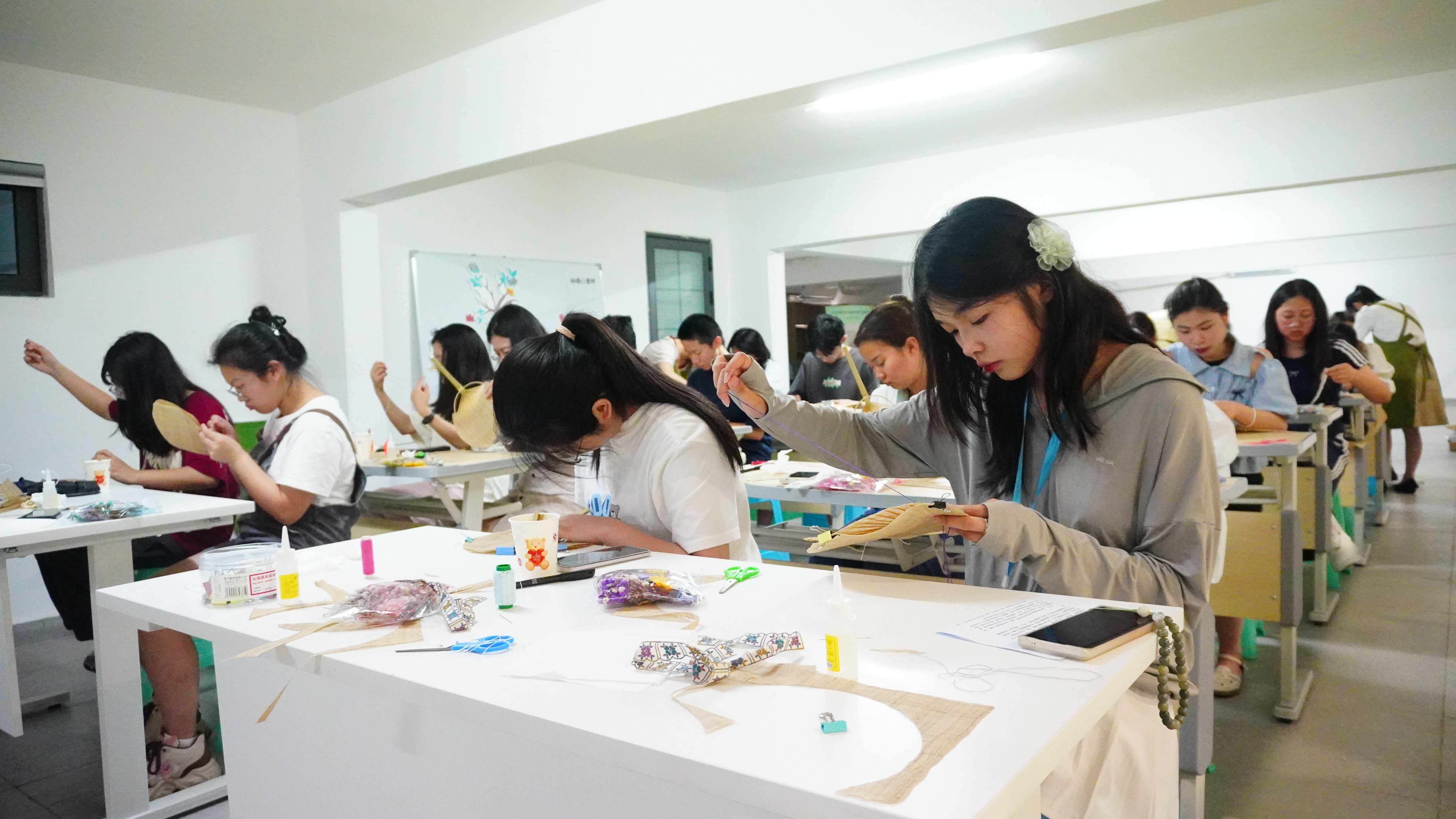 “夏布”以苎麻为原材料,因轻柔胜丝、避暑爽身,实为暑天衣料佳品而得名。荣昌作为中国夏布之乡,更是享有夏布“轻如蝉翼、薄如宣纸、平如水镜、细如罗娟”的美誉。受学生园区特设党支部邀请,从事夏布传承学习及研究工作超十年的夏布非遗传承人马琳沁受邀担任教学嘉宾,为同学们介绍夏布的文化蕴意和制作工艺,并亲自指导同学们制作夏布手工团扇。学生园区自我管理委员会的成员们也提前为同学们准备了夏布、包边布、扇架、米浆、干花等团扇制作材料。在马老师的悉心指导下,同学们点涂、喷洒、修剪、晾干,一个个小巧精致的夏布手工团扇相继诞生。制作完成后,同学们纷纷扇动自己的专属团扇,小扇扇起微微凉风,在夏意渐浓里,拉长非遗传承的时光。